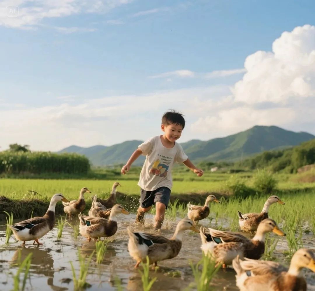 挥舞小竹竿,化身小小“鸭司令”,在绿油油的秧田间,和憨态可掬的鸭子们来一场欢乐追逐!