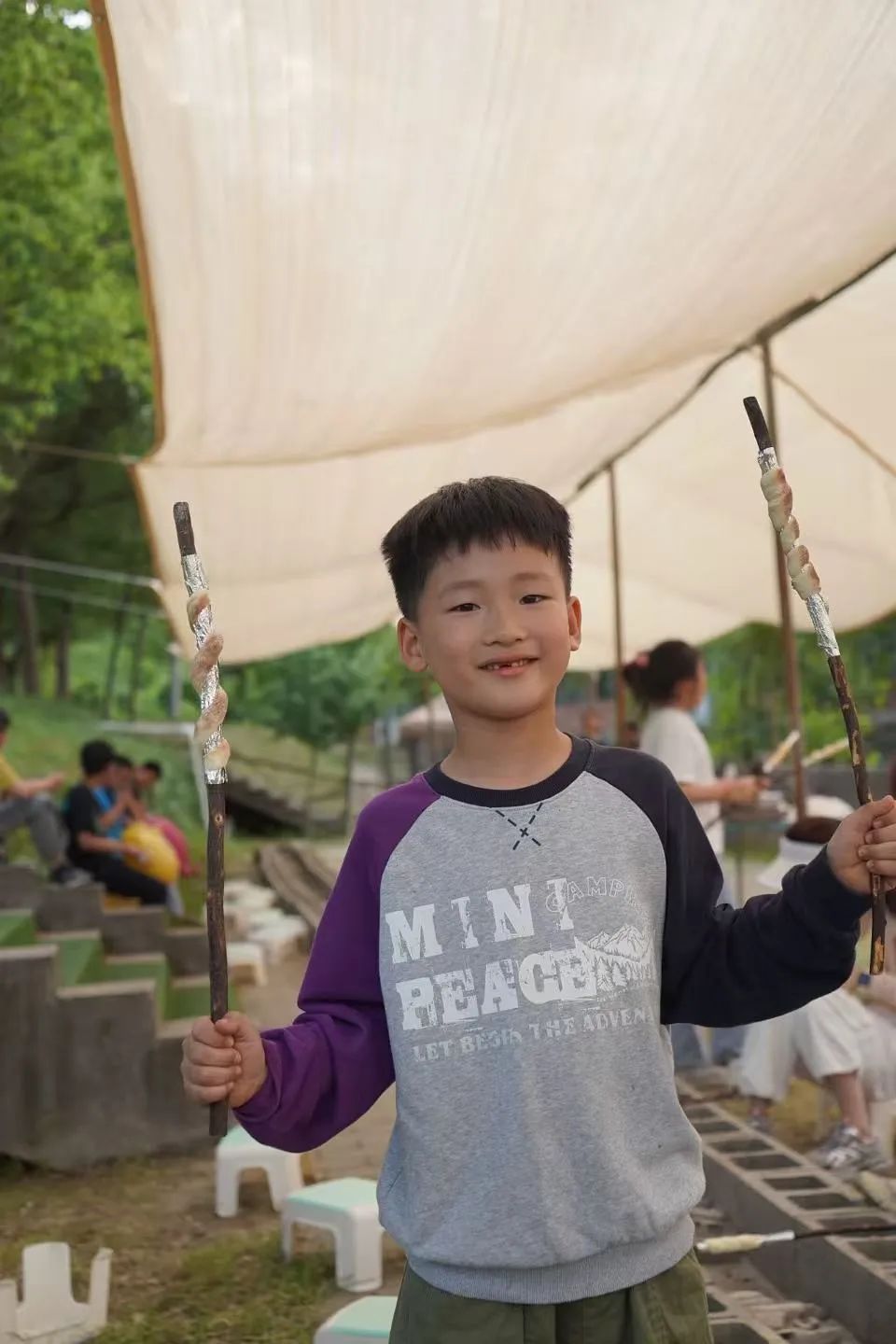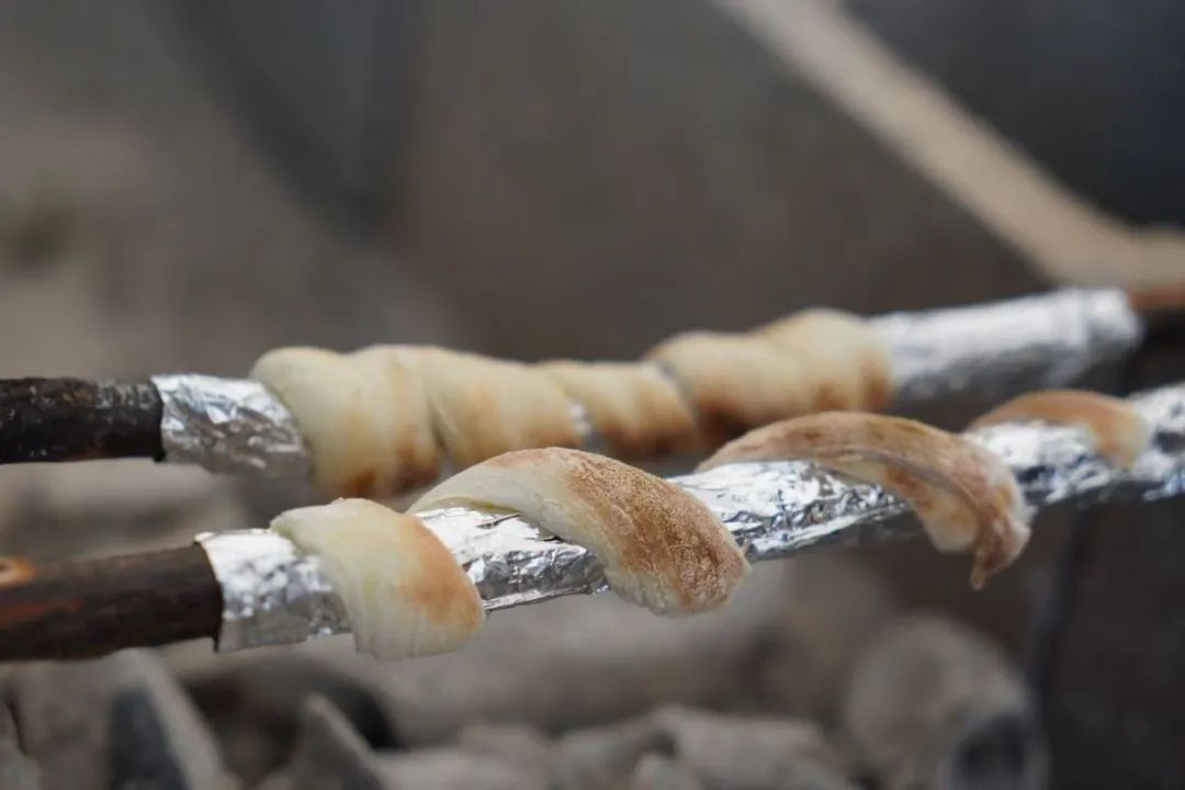 把你的面团搓成长条→缠绕竹竿,架在火堆上均匀受热→面团开始膨胀了,香味跑出来了→转动你的小竹竿,面包就快烤好啦!