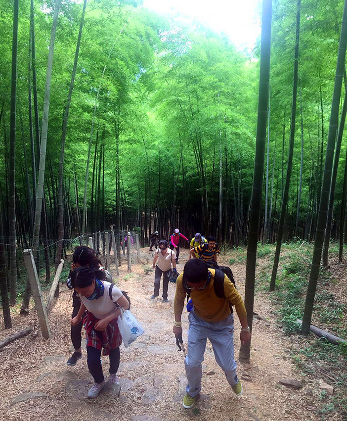 10:30左右,我们穿过【宜兴】市区,来到【黄塔顶】脚下的【岭下村】,我们将沿着幽幽竹林古道,徒步而上,起始段一路往上冲顶苏南第一峰:【黄塔顶】。